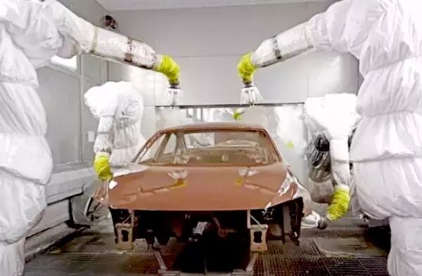 涂装车间率先在吉利集团采用水性免中涂工艺,在保证车身防腐性能和油漆外观质量的同时,减少VOC排放50%,降低能耗30%,是目前世界涂装领域最先进的工艺。无论是在车身底部的UBC喷涂,还是色漆、清漆的喷涂,甚至到喷涂过程中的门盖的开启与关闭均采用涂装行业全球最先进的39台德国杜尔机器人来实现。