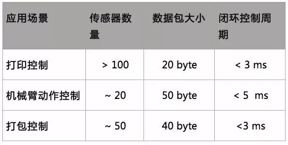 闭环控制系统不同应用中传感器数量、控制周期的时延要求、带宽要求都有差异,典型来看,周期时间和通信带宽大小的一些典型值如下:
