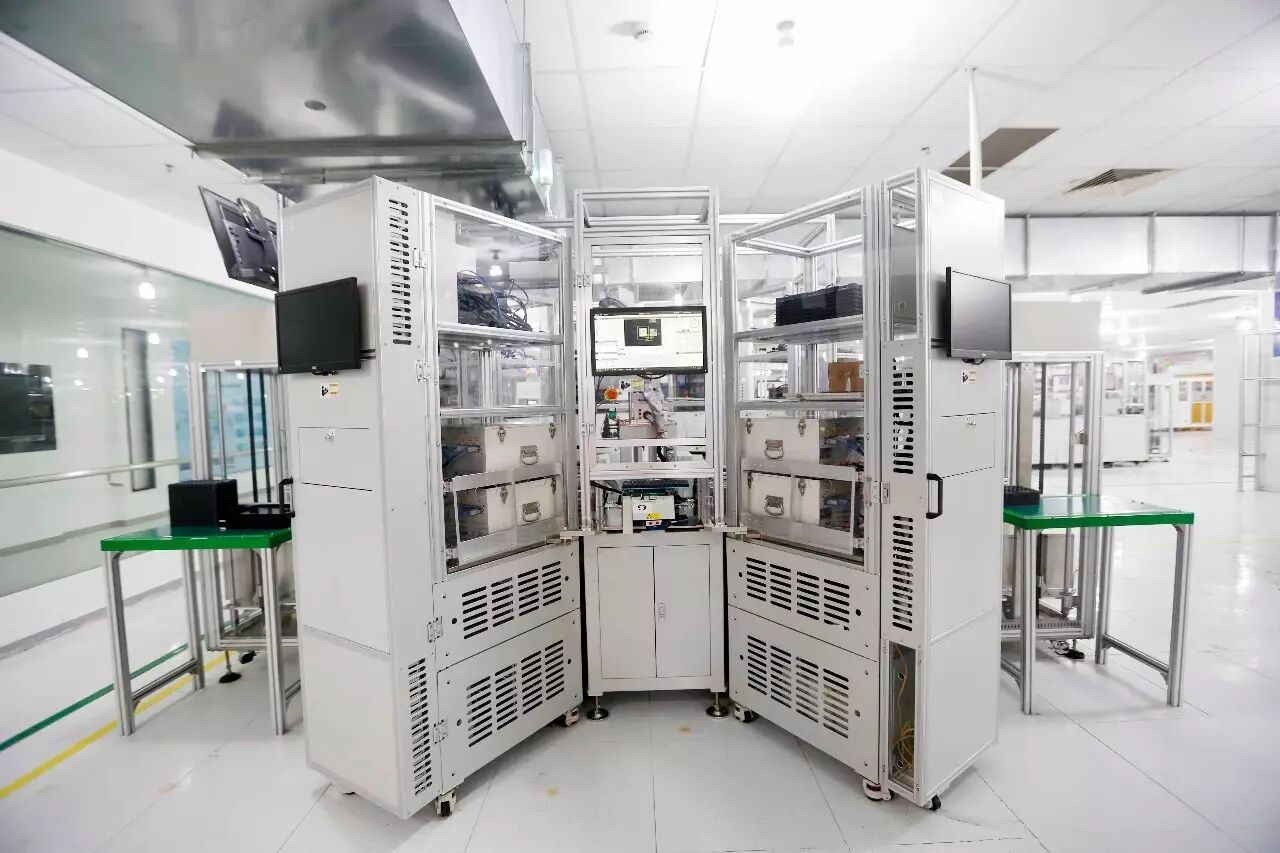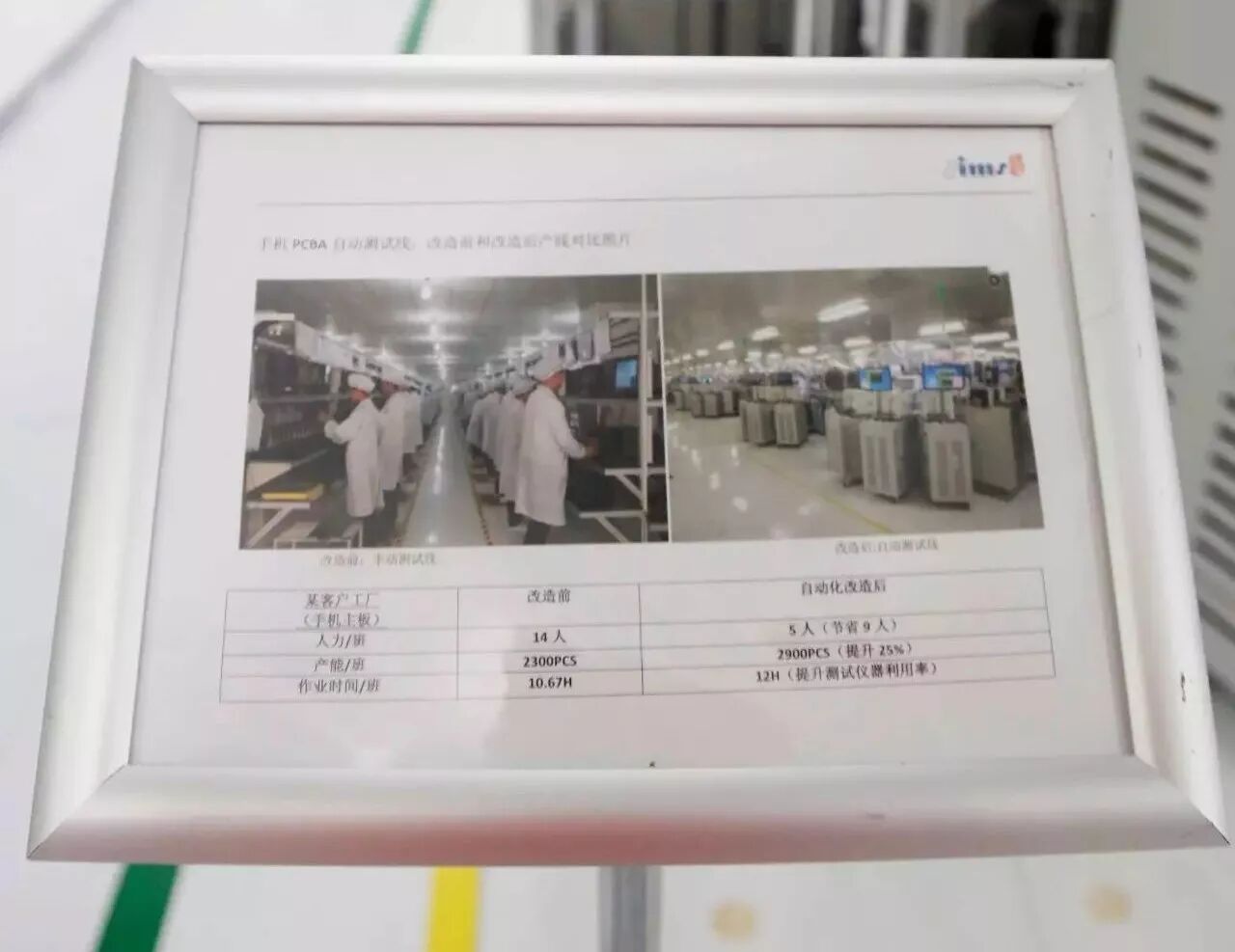车间的左侧整齐规划了四条无人化的“手机通讯主板自动测试线”,手机主板可在流水线上完成从下载到校准的工序,全程只需要1到2名维护人员。