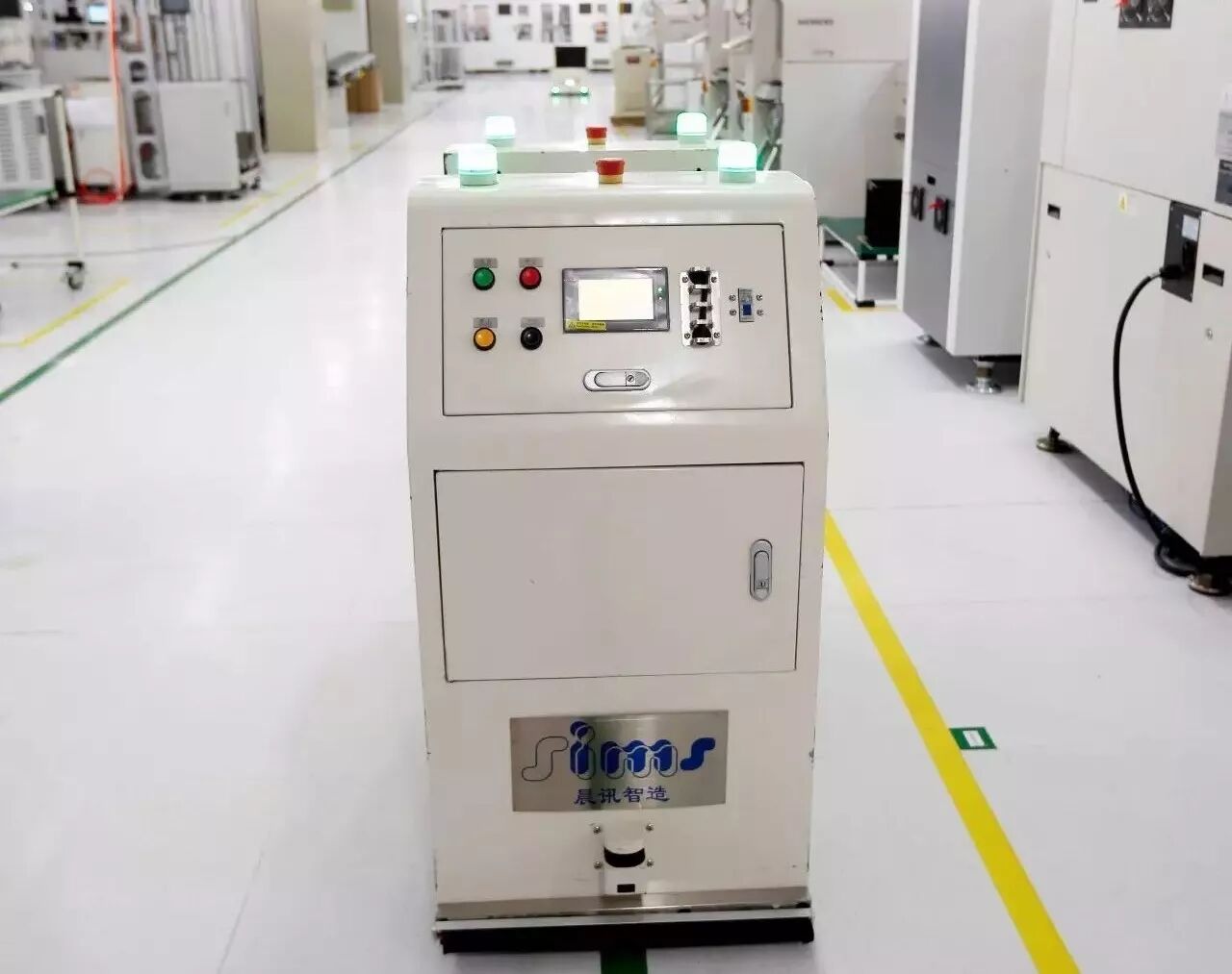 ▲ 机器人小车能自动加料、送料,沿着地板上的轨迹线移动,遇到障碍物还会避开。
